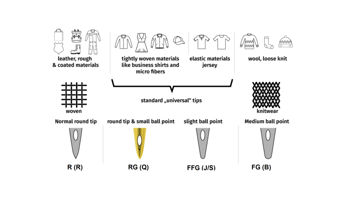 Materiali tessuti allentati, elastici, invece, richiedono un ago con una punta leggermente rotonda, cioè una punta leggermente sferica / sferica media (FFG/J/S), che sposta i singoli fili ma non li perfora.