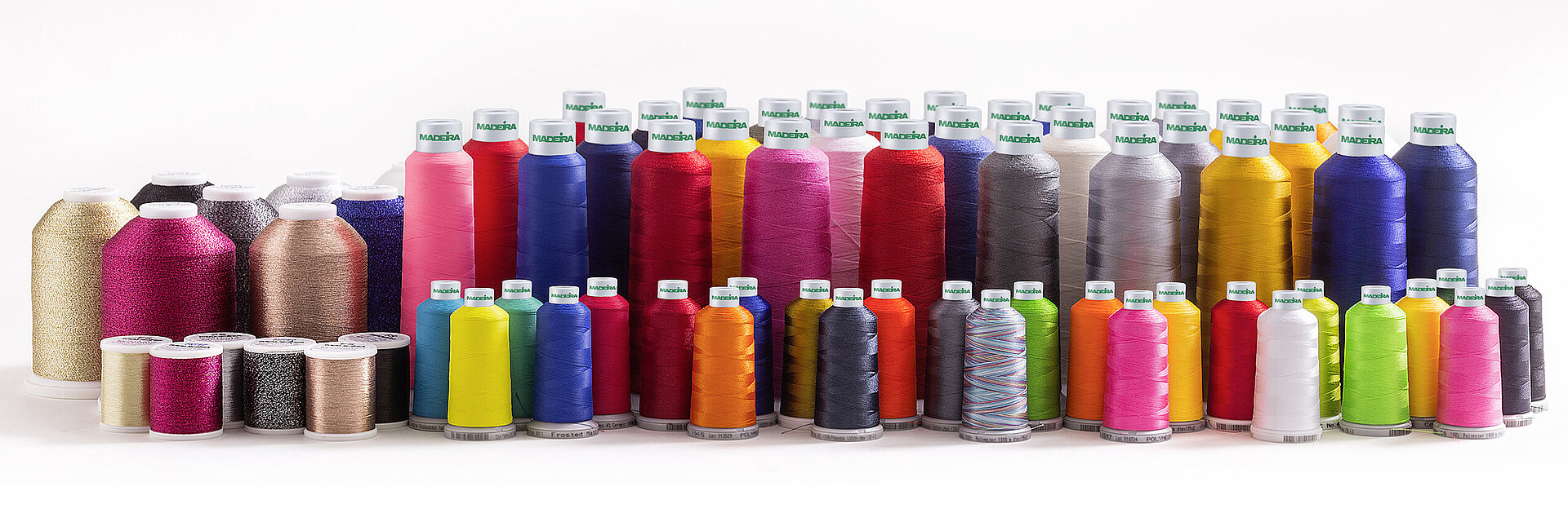 The top and bobbin threads and how one works with them impacts the productivity, the appearance and resistance of the design, the consistency of the results, and the functionality and certification of the final product. To identify suitable embroidery threads for a project, you need to evaluate their shine, texture, colour palette, thickness, make-up, quality, colour fastness, robustness and how they function during production. Whether you plan to design or personalise textiles, to produce promotional or fire-resistant items or to add smart features, we will help you to choose the best performing threads. In Madeira's one-stop shop you can find a variety of threads and supplies for embellishments, technical embroidery and decorative sewing.