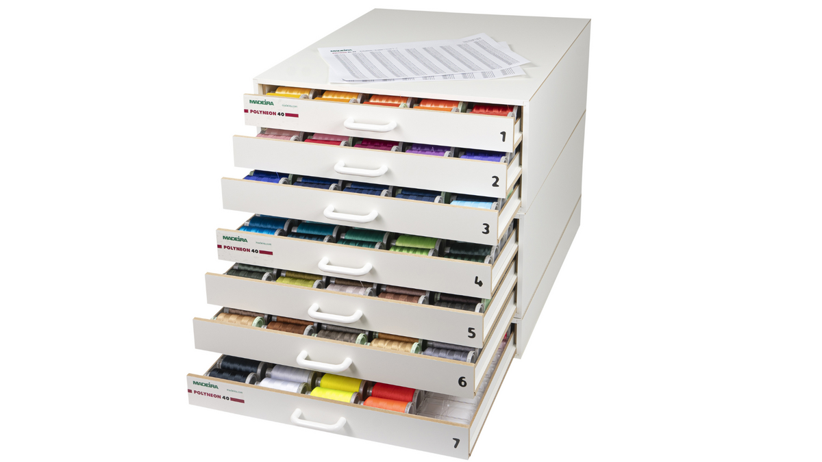 Comprend les 413 couleurs individuelles du fil Polyneon 40 standard, présentées dans trois boîtes en bois empilables.