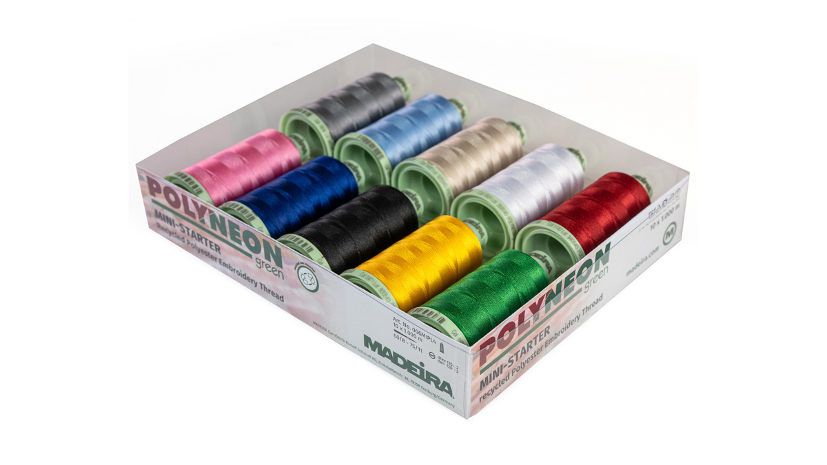 Découvrez les fils à broder Polyneon avec nos coffrets d’assortiment professionnels et nos kits de démarrage. Testez différentes teintes, développez des échantillons et prototypes, et trouvez rapidement les couleurs idéales pour vos projets de broderie.